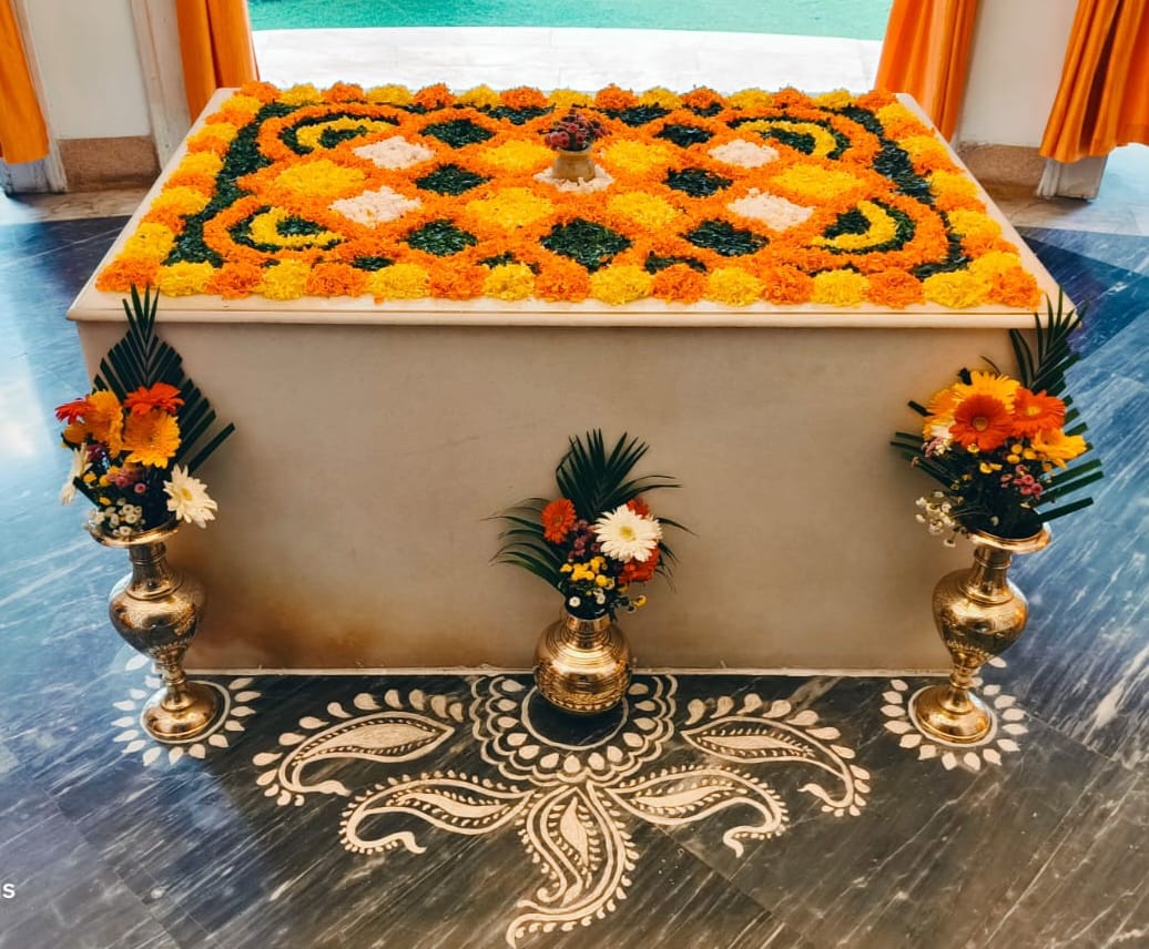 On 21st February, 1998 - the 120th Birth Anniversary of The Mother - amidst the scented mist of glowing joss-sticks, fragrance of flowers, offerings of devotional songs, recitation of poetry and adoration of Her children, The Mother's statue was installed near the 'Sacred Relics' at Lakshmi's House by Smt. Uma Siddhanta and Shri Manindra Rajvanshi.